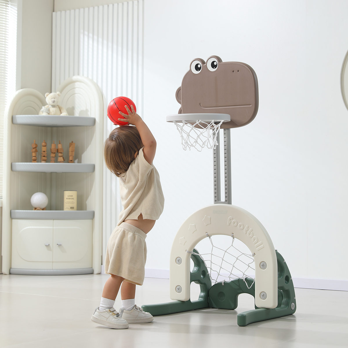 Для обеспечения устойчивости конструкции основание баскетбольной стойки имеет водоналивное отверстие. В нижней части стойки расположены футбольные и хоккейные ворота. В комплекте со стойкой идут футбольный и баскетбольный мячи, а также клюшка и маленький мяч-шайба. Стильный дизайн и спокойная цветовая гамма позволяют прекрасно вписаться в любой интерьер. Отлично сочетается с другими детскими товарами марки Unix Kids. Желаем вам новых побед!
