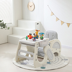Главная особенность стульчика – возможность трансформировать его в комплект детской мебели со столиком и стульчиком. Несколько игровых полей в комплекте сделают времяпровождение с трансформером еще более увлекательным! Вы можете без труда менять поле для игр – поставить поле для деталей лего, или поля для игр с водой или песком, или же поставить классическое поле для рисования и лепки. Комфорт и множество возможностей для игр сделают этот набор любимым местом малыша!