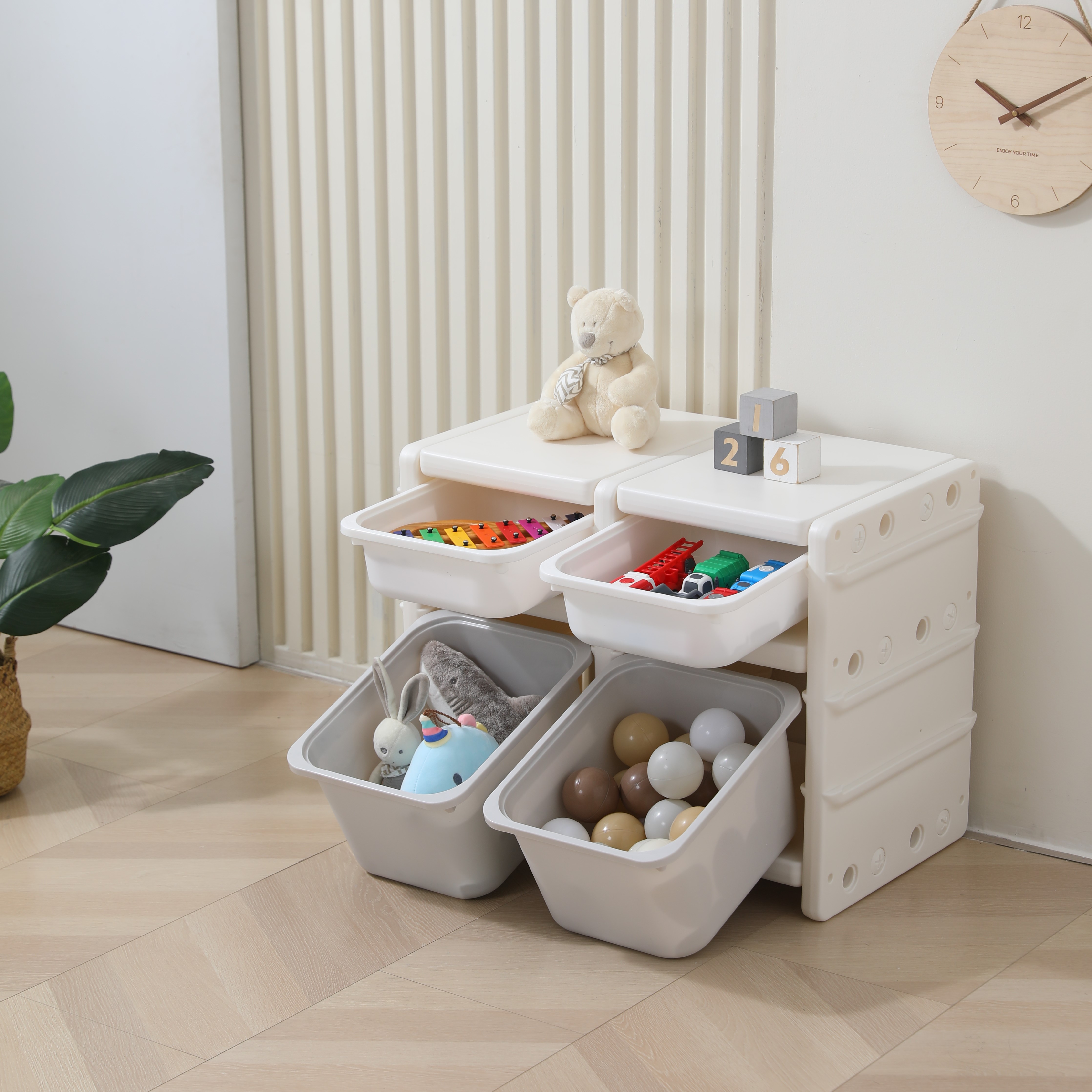 Наш пластиковый стеллаж для игрушек имеет светлую цветовую гамму, что позволяет ему идеально вписаться в любой интерьер и прекрасно подойти для детских комнат мальчиков и девочек. Этот стеллаж - прекрасное решение для хранения как мягких игрушек, так и более тяжелых предметов.
