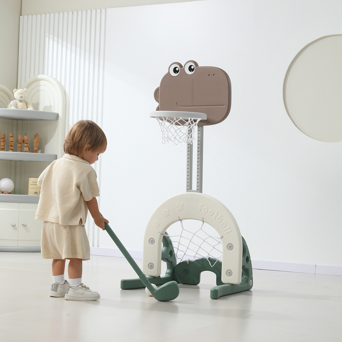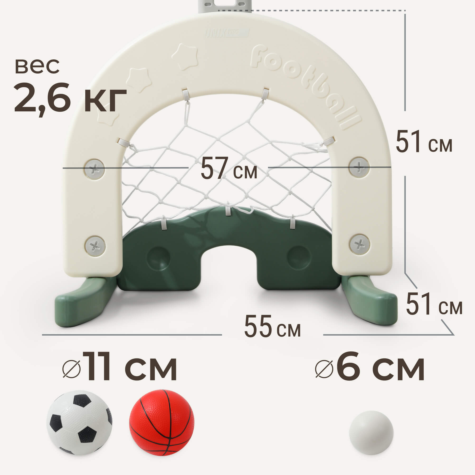 Для обеспечения устойчивости конструкции основание баскетбольной стойки имеет водоналивное отверстие. В нижней части стойки расположены футбольные и хоккейные ворота. В комплекте со стойкой идут футбольный и баскетбольный мячи, а также клюшка и маленький мяч-шайба. Стильный дизайн и спокойная цветовая гамма позволяют прекрасно вписаться в любой интерьер. Отлично сочетается с другими детскими товарами марки Unix Kids. Желаем вам новых побед!