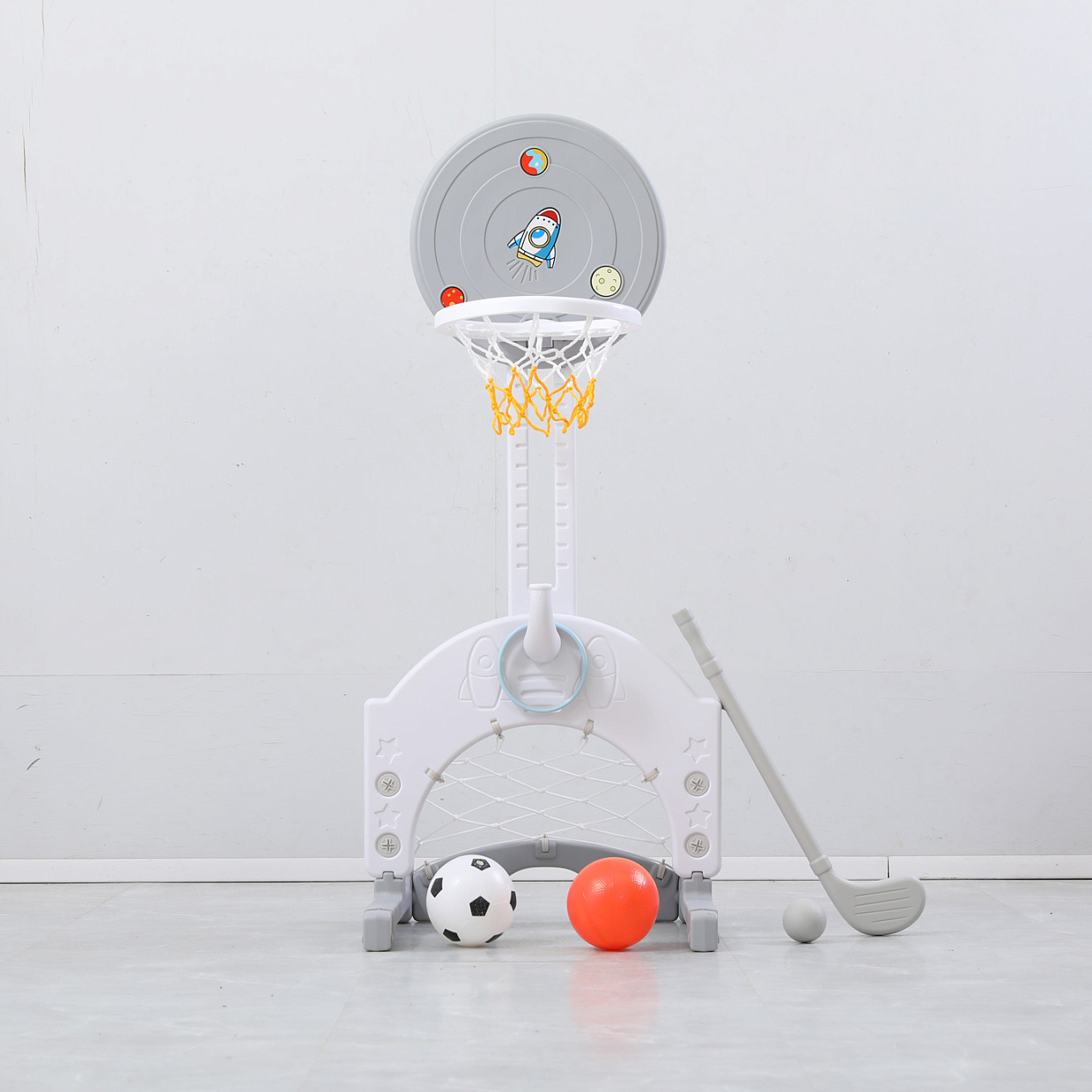 Выполнена стойка из прочных материалов, обеспечивающих надежность и безопасность во время игры. С помощью регулировки высоты стойки, вы сможете подстроить ее под рост вашего малыша.