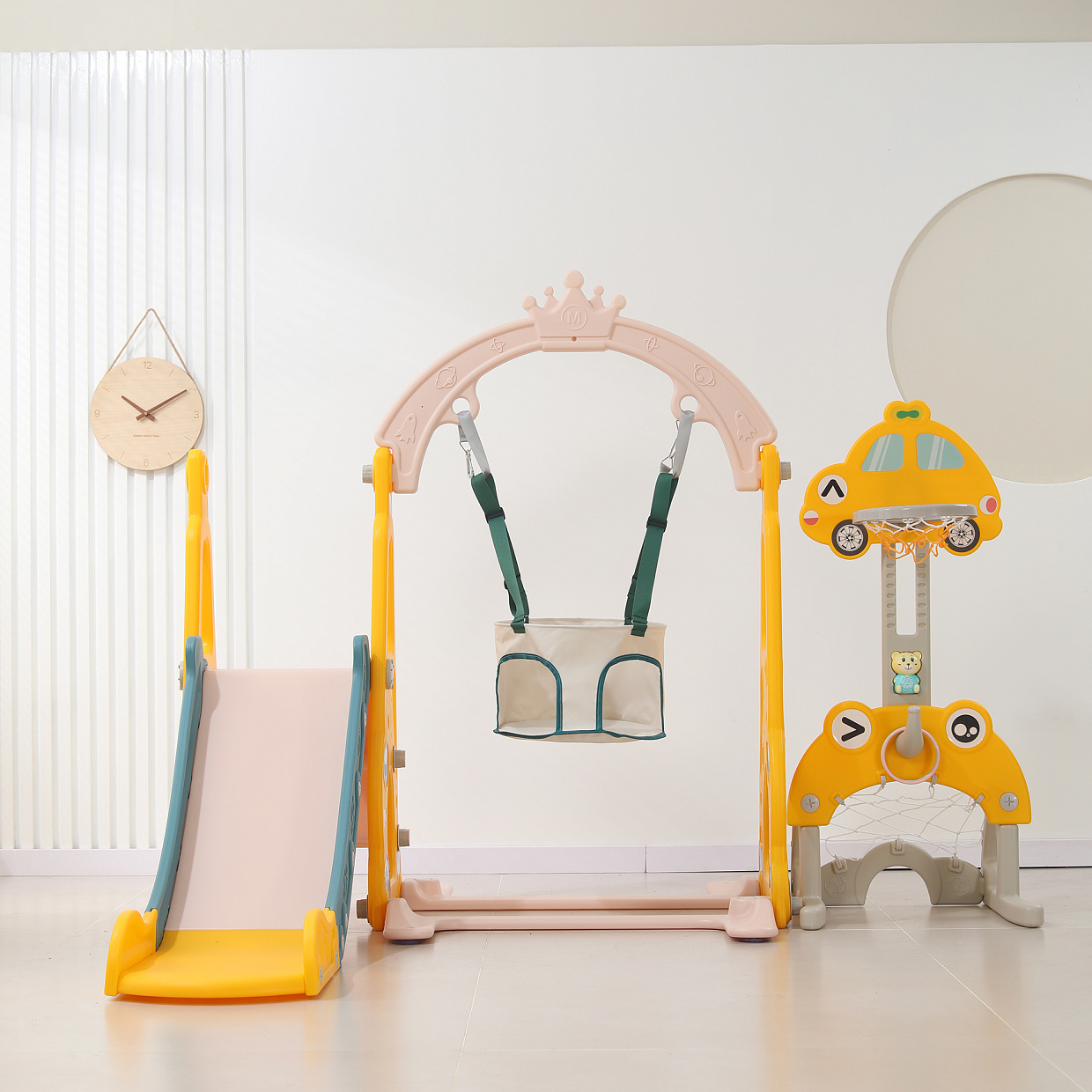 Горка с качелями и баскетбольной стойкой UNIX Kids Funny Car / Забавная машина (160 см) жёлтый